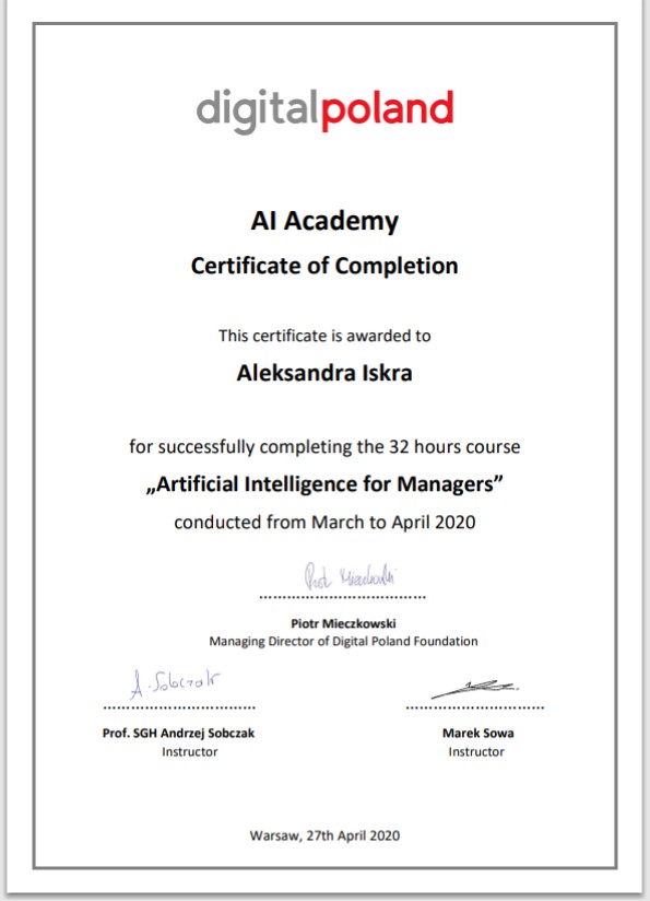 Szanowni Państwo, miło mi poinformować, że w kwietniu 2020 r. ukończyłam szkolenie organizowane przez Digital Poland ,,Artificial intelligence for managers”. Sztuczna inteligencja zbliża się wielkimi krokami, ale do scen znanych nam z science-fiction zapewniam, że jeszcze bardzo daleko.