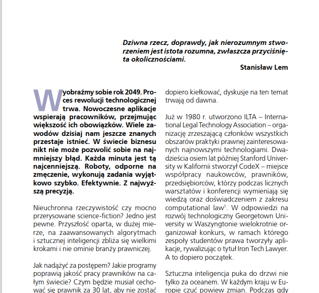 Szanowni Państwo, właśnie ukazał się najnowszy numer 28/2020 ,,Przeglądu Radcowskiego" - Kwartalnika Okręgowej Izby Radców Prawnych we Wrocławiu, a w nim artykuł adwokat Aleksandry Iskry ,,Prawnik w obliczu sztucznej inteligencji". Zapraszam do lektury :)
